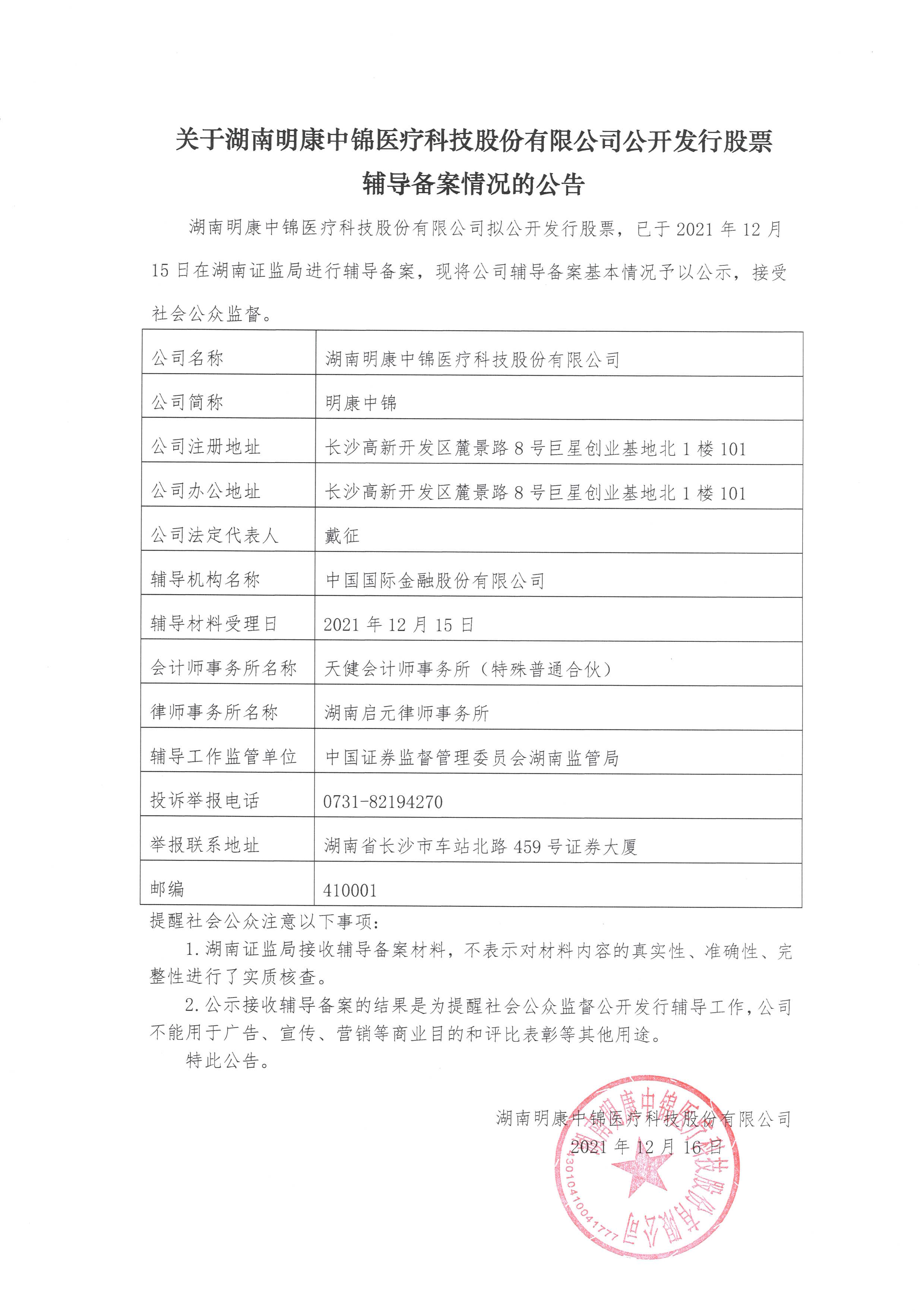 關(guān)于湖南明康中錦醫(yī)療科技股份有限公司公開發(fā)行股票輔導(dǎo)備案情況的公告