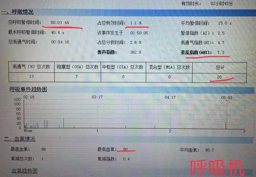 經(jīng)過醫(yī)院的睡眠監(jiān)測確定是阻塞性睡眠呼吸暫停低通氣綜合征。當(dāng)時睡眠監(jiān)測報告AHI達(dá)到62,屬于重度呼吸暫停,血氧67%,血壓160/100,有輕度的嗜睡癥狀,臉色比較蒼白,無精打采。醫(yī)生建議使用無創(chuàng)呼吸機(jī)通氣治療。